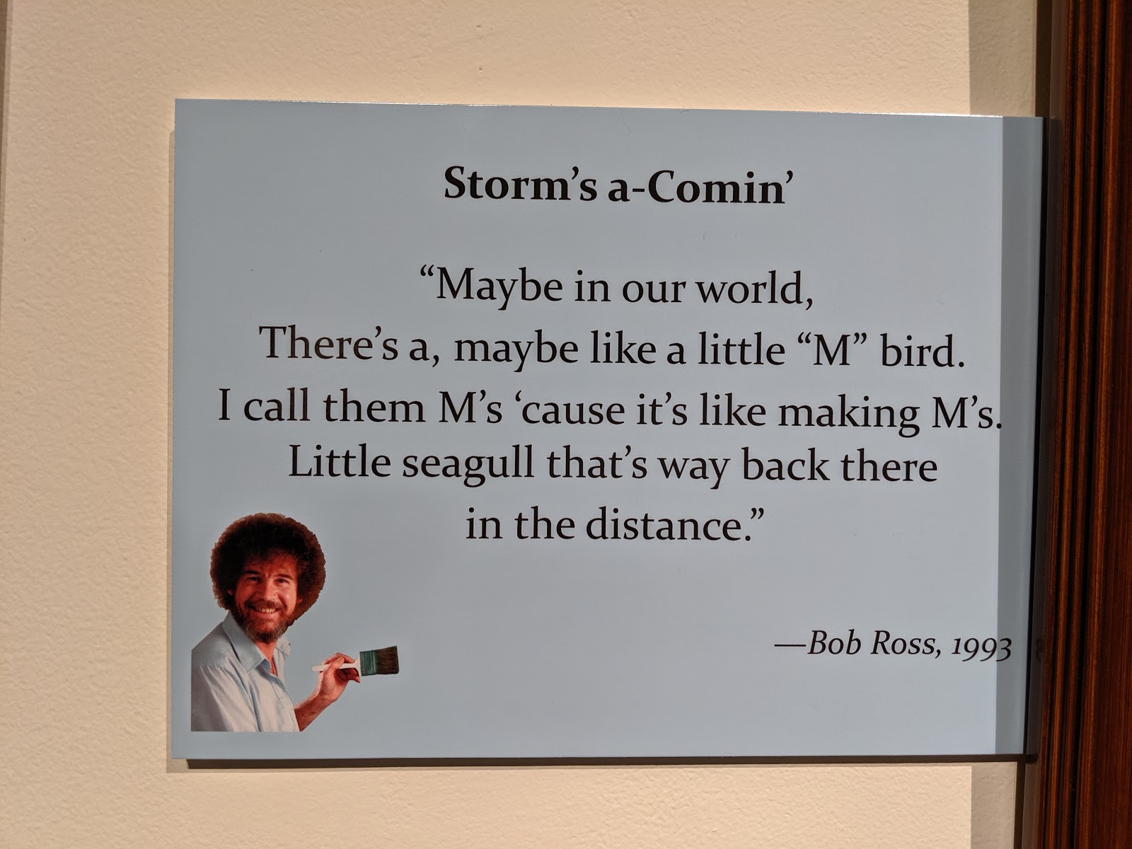 the teen and i got tickets! we were lucky! and he said afterwards that it was so worth the drive there and back to get to see these paintings in person, so close that you could see the level of detail that the painter alluded to in his broadcasts. the happy little trees, happy little clouds, mountains, cabins, so much of the beauty of nature captured on canvas. gorgeous.
