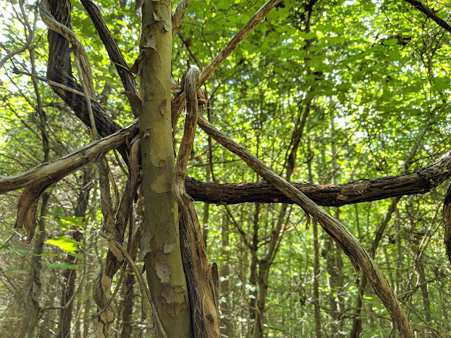next up was basketweaving, a much better use of vines than wreath making, according to tim (he has a vendetta against wreaths). tim had cut, cleaned, and dried wisteria vines from his parents' place for us to use; he also took us to check out other useful vines like green briar (you need to pull the nasty little thorns off), honeysuckle (peel off the white papery bark to keep it supple and workable), and grapevine (thick and woody but has a tendency to become brittle).